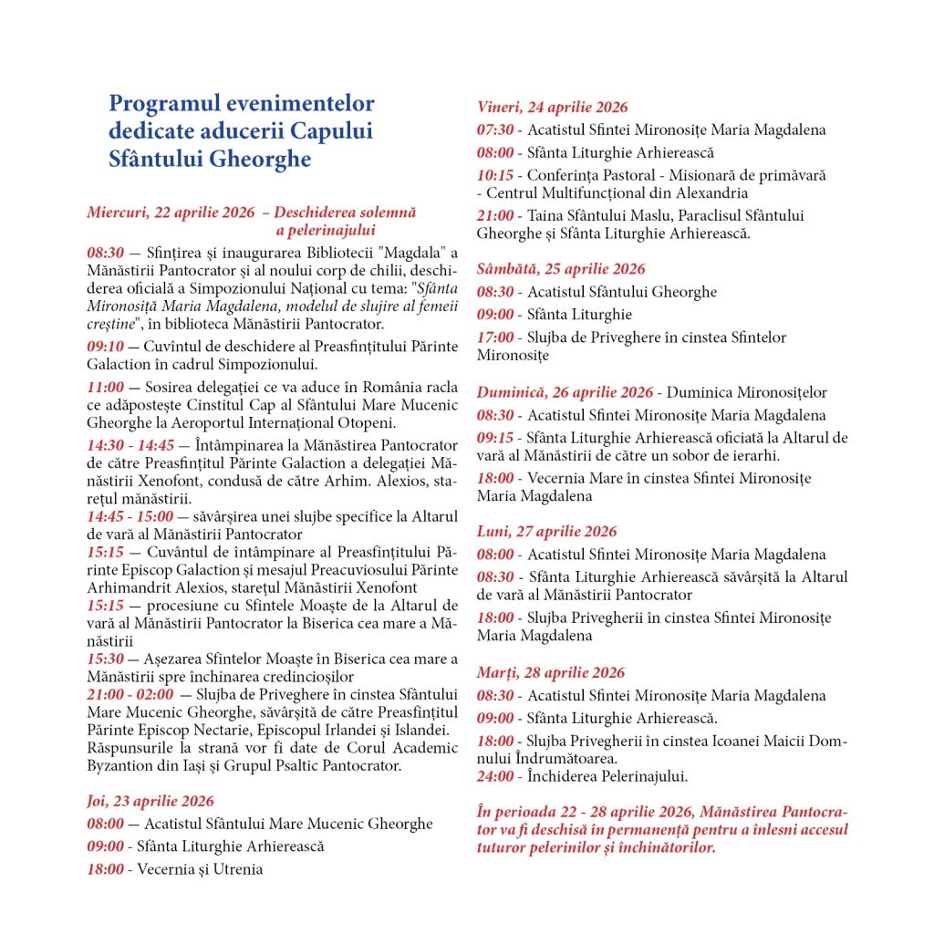 Programul aducerii Cinstitului Cap al Sfântului Mare Mucenic Gheorghe